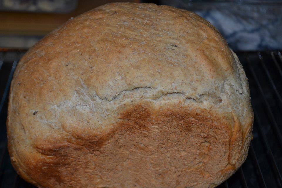 Pour the warm water, oil and lemon juice in the bread machine's bread pan (unless your bread machine instructs to place yeast first, in which case, reverse the order given here). Place the flours into the bread pan next so that it covers the liquids well. Place the milk powder, salt, sugar in the corners of the bread pan. Make a shallow indentation in the middle of the pan and place the yeast in the middle. Set your bread machine for basic/normal setting with medium crust. Add the caraway seeds when the machine beeps for nuts/fruits.